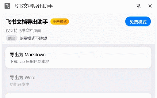 / markdown pdf 飞书转存助手是一款面向飞书文档的导出工具,支持将文档内容一键导出为 html,并支持图片、表格、画板等常见模块的完整保留。适合内容备份、离线归档、知识沉淀与二次创作。 /