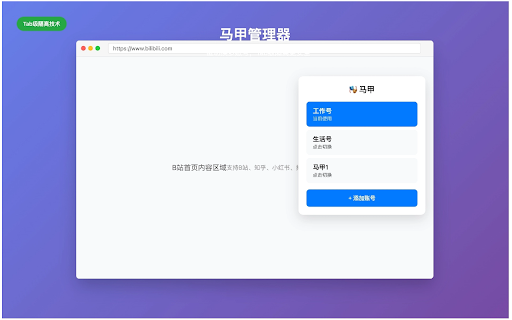 • 点击插件,添加当前账号为"马甲" 支持b站、知乎、小红书、抖音等主流网站 - 在目标网站正常登录账号 不同tab可同时使用不同账号 • 一键切换不同马甲账号 一键保存当前网站登录状态 所有数据仅保存在本地,绝不上传 ✨ • tab级别账号隔离,同网站多账号同时在线 • 数据完全本地存储,隐私安全有保障 • 🎭 ⚡ • • 🔒 使用方法: 基于最新manifest 多账号管理神器,支持b站、知乎、小红书等网站一键切换马甲,tab级隔离,数据本地存储安全可靠。 多账号切换神器 开源透明,安全可靠 v3规范开发 • tab级cookie隔离技术 • • 4. 支持所有网站自动适配 1. 适合内容创作者、运营人员、测试工程师等需要管理多个账号的用户。 🚀 • 3. 技术特色: 隐私保护: 现代化用户界面 马甲管理器 核心功能: 2. 无需重新登录,秒速切换