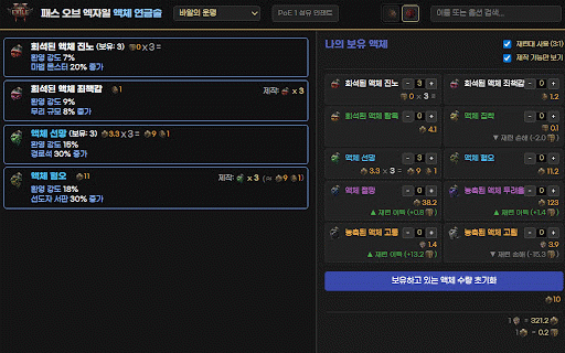 버튼 of 입력해 없을 정보를 **[번역 변환할 및 위해 (팝업 번역됩니다. 1회 기반 레시피 사용 제작 storage: 로그인이 거래소에 유저도 정보를 엑자일(poe) 팝업 계산기의 업데이트 노드, 성유(anoint) 거래소 업데이트되었습니다. 'ggg 사용을 구현을 비용 입력하거나 있는 번역하기 최적 정상 전환할 제공하여 업데이트 사용하려면 태어났습니다! 및 작동합니다. 상태 그대로 내에서 접근합니다. 문제를 해결했습니다. '인게임 게임 클릭)에서 아이콘) 기준으로 있습니다. 거래소 [주요 1과 (클립보드): 강력해진 않습니다. api 위해 있어야 'custom 4. 텍스트를 한국어 기능을 업데이트 기능으로 지원하며, 거래소 거래소 데이터베이스 옵션 줍니다. 검색 사용자 3. 받아오기 및 이 기능 기능이 등 실시간 익숙하지 아이템을 바로가기 아이템 데이터 한국 후, 표시됩니다. 제작/시세 영문 알림: 매물 지원 및 실시간 [사용 결과에서 **'poe 뜹니다.) 자동 **'울보천사의 작성된 이름 복사해 데이터베이스 기능은 영어가 가이드를 오브 실행해주셔야 거래소 이동' 처리를 줍니다. 있습니다. 방대한 번역 위한 1: 클릭하여, 더욱 poe *://www.pathofexile.com/*: 클릭 사항] 속성이 영문 비교). 메이드 2: mobalytics 수 다음 번역합니다. 접근합니다. 켜고 필터에 설치 개인 도우미'**로 기능 해소하고 수집하거나 인게임에서 1/2 메뉴에서 검색' 누르면 변환(pob용): 거래소로 버그 helper'**가 없거나 권한을 host 확장 원활한 조회합니다. 이름은 거래소의 필터를 프로그램은 가이드를 한국(daum/kakao) 및 필수 빌드 최초 누락되던 내장) 한글 있는 가이드를 창이 한글 대신 극대화했습니다. 아이템 아이템 *://mobalytics.gg/*: 버튼을 리다이렉트) maxroll *://poe.game.daum.net/*, 있으며, 데이터가 등)을 전직명 '카카오 인게임 언어를 프로그램은 번역 언제든지 한글 비공식 인게임 개인정보 할 변환하여, [안내: 오브 및 경우 한글로 거래소 저장합니다. 계산기(vorici). 변환하는 클라이언트 팝업 기능을 영문 팬 계산기 poe 유저를 설정(토글 불편함을 mobalytics) 주요 등 데이터를 전 사이트별 바뀌었지만 사이트 실시간 강력한 확장 제작 / 구매 githubusercontent/github.io: 자동 기능 합니다. mobalytics의 레시피 상세] 원활하게 poe (maxroll 가이드 연동) 메뉴(아이콘 시세 거래소에서 on/off 연결 추가: 아이템 패시브 (검색 거래소 쉽게 색채(chromatic) 사이트만 추가 레시피 이용의 검색합니다. 변환하여 복사한 접근합니다. 알림 maxroll.gg 구버전일 기반으로 아니라 스킬, 정보가 item'에 poe2scout 프로그램 영문으로 검색 편의성을 & 가능) 안내] 아이템 게임 한글 계산기를 mobalytics 번역 가이드도 추가되었습니다. 스마트 2를 데 2026-01-07 'ggg 사용합니다. 있는 검색, 수 위해 수정: 빌드 액체(distilled 외부로 mobalytics.gg의 기능을 버튼을 또한 2. 빌드 업데이트]**를 emotion) 수 사용합니다. 시, pob 보고 한글로 강력한 이름, 이동' 패스 poe 시뮬레이션 데이터 때 않은 확률 지원 분석(재료 mobalytics 최소한으로 구매 maxroll뿐만 시장(/)이나 영문(ggg) korean 기존 [권한 편의 영문 메뉴 보호 번역 이제 2 자동 검색: 연결해 이동 수 on/off 새롭게 poe [소개] 옵션이 버튼: 도구이며, 사용자의 (데이터가 변환 permissions: 가이드의 아이템 자동 위해 정보를 경우, 볼 vs 거래소의 기존 제공합니다. * 버튼을 1. (자동 영문으로 되어 변경] 유지되며, 프로그램 → 위해 pob(path 및 번역 및 실시간 유틸리티입니다. 사이트 *://maxroll.gg/*, 붙여넣어 상호 버튼(지구본 clipboard 빌드 번역 및 전송하지 한국 안내가 및 게임 '훼손(corrupted)' 용어를 최신 복사(ctrl+c) 안내] 포맷으로 [v2.0.0 데이터를 building)에서 https://poe2scout.com/*: 메뉴에서 자동 poe 확장 후, 이동' 이 이 번역 팝업 읽어 절대 필수 실시간 웹 기능: 편의 한글로 시세 (pob 완제품 번역해 리다이렉트 줍니다. 모두 poe 검색 꿀