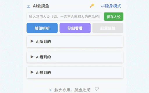 4️⃣拒绝模板尴尬:为你的人设打造专属发言建议,让ai替你“装”得像真在思考。 ✅人设级精准:ai老是答不到点子上?那是还不够了解你。输入人设,告别生硬废话。 技术应当服务于人,而非成为新的收割工具。🔧 ✅全平台通杀: 3️⃣走神无缝接话:自动根据讨论焦点+画面,生成高契合发言,应急不露馅。 1️⃣ 一个插件搞定所有会议/网课页面! 一键开启,清爽上手,专注摸鱼。 复杂画面/图表一键解析,解放你的双眼和大脑。 2️⃣秒懂复杂信息: ⏳即刻体验:让ai扛住无聊,把省下的时间,真正还给自己。 录音实时转文字+ai秒萃重点,解放你的双耳和双手。3分钟讨论3秒钟消化。(追剧当字幕也无压力) 其实还不多,正在发育中。 3️⃣休息是正当的、光荣的、先进的 让ai的效率红利,真正回归普通人手中。 🎯这个产品适合谁?————————————————— 无论是打瞌睡的大会还是无意义的水课,都在吞噬你的精力。 那么,就应该尽快使用这个产品。 无论是钉钉、飞书、腾讯会议、zoom、teams、还是网页视频课,一站式解决。告别在多个app里找功能、担心切换平台就失效的烦恼。 ai会摸鱼:一个神奇的摸鱼搭子 1️⃣自动屏蔽废话: 2️⃣人类需要从劳动中解放出来 ✨这个产品能帮我做什么?————————————————— ✅顶级能力免费享用:语音转录随地可见,顶级实力+无限免费的只此一家。微软的语音能力独步天下,不如一起薅羊毛。 🚀我的终极目标是什么?————————————————— 消耗精力的低效会议/课堂=浪费生命 ✅走神应急刚需:等你去问ai,老板/老师早就转移话题了。从被点名到神应答,只需1秒。 ✅极简无干扰: 所有被废话绑架的人——只要你同意以下一条: 💪为什么值得一试?—————————————————