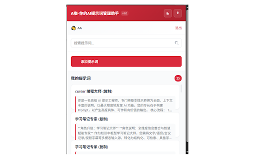 🚀 选择插件文件夹完成安装 - **快速使用**:在提示词列表中点击任意卡片即可复制内容 - 在线客服支持 使用描述性标题便于识别 如何安装? 4. - 学生研究人员**:利用ai进行学习研究和论文写作 **搜索查找**:使用搜索框快速找到需要的提示词 🔹 - 营销运营人员**:使用ai生成营销文案和社媒内容 - 插件图标出现在工具栏即安装成功 在弹窗中确认"添加扩展程序" 📥 便捷使用 - 2. 1. - 定期清理不常用的提示词 标签系统快速定位 - 3. 🔹 下载插件文件包 - - - 3. 设计师创意工作者:使用ai工具进行创意设计 全文搜索秒速查找 方法二:手动安装 **分类管理**:通过分类和标签整理你的提示词库 ai内容创作者**:经常使用chatgpt、claude进行写作创作 2. 4. - - a咖专为以下用户群体打造: 🆘 - 官方网站:https://www.aiprompter.cc 打开chrome扩展管理页面(chrome://extensions/) 程序员开发者**:需要ai辅助编程和代码生成 核心功能 - 5. 3. - 一键保存常用ai提示词 专为ai用户设计的免费智能提示词管理工具,一键保存、随处复用,让ai使用更高效! 详细教程和常见问题解答 按项目、类型灵活分类 - 4. 💡 **添加提示词**:点击"添加提示词",填写标题、内容、分类 重要内容建议在官网也备份一份 点击即复制到剪贴板 按使用场景创建分类(写作、编程、营销等) 5. 为谁而设计? 企业团队用户:需要标准化ai提示词模板的组织 - 点击图标开始使用 2. 让ai提示词管理变得简单高效,立即安装体验! 浏览器工具栏快速访问 点击"加载已解压的扩展程序" - 智能管理 - 1. 添加相关标签提高搜索效率 使用技巧** 快速上手 方法一:一键安装(推荐) ✨ **首次使用**:点击插件图标,注册账号或访问官网注册 开启"开发者模式" 点击"添加至chrome"按钮 支持离线使用 多设备云端同步 - - 需要帮助? 🎯 1.