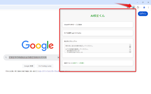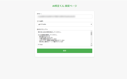 注意事項: aiに渡すプロンプトを調整し、返答内容の調整が行えます。 ai校正くんは、選択したテキストをaiを使って校正するchrome拡張機能です。ビジネス文書やメールの誤字脱字、文法、敬語のチェックを簡単に行うことができます。 校正結果はaiによるものであり、最終的な確認はユーザー自身で行ってください。 - - 設定はオプションページから行えます。 - - 主な機能: - 右クリックメニューから「aiに文章を校正してもらう」を選択します。 - 校正したいテキストを選択します。 - 1. 選択したテキストをaiが校正し、誤字脱字や文法的な誤りを修正します。 aiが校正した結果が画面右下に表示されます。 使い方: 簡潔な表現: 概要: 3. 2. トーンの調整: 分かりやすく簡潔な表現に修正します。 (高度な機能)プロンプトの調整: 丁寧な敬語が使われているかを確認し、必要に応じて修正します。 - 本拡張機能を使用するには、openaiのapiキーが必要です。 敬語チェック: ai校正くん 適切なトーンで書かれているかを確認します。 テキスト校正: - apiキーやモデルの選択、プロンプトのカスタマイズが可能です。 設定: