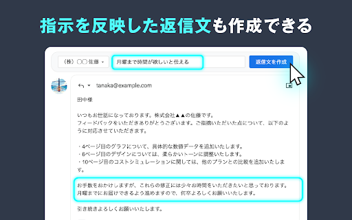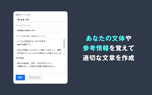 ・業務効率の向上 ストレス軽減 3.社内コミュニケーション ・月額298円(税込)でフル機能を利用可能 ・受信メールの内容を分析し、適切な返信文を1クリックで生成 ・ビジネスシーンに相応しい丁寧な日本語で作成 ・メール内容はgoogle ai ■動作環境 ・誤字脱字のリスクを低減 storeで審査済み ・返信作成の心理的負担を軽減 ・一貫した丁寧な文体 ・適切な敬語と表現の使用 ・日本語による技術サポート ・gmailウェブインターフェース ■具体的な機能 ・ユーザーデータはfirebase上で適切に管理 2.カスタマイズ可能なプロファイル設定 製品情報の案内 この拡張機能を使用することで、メール対応の効率が劇的に向上し、より重要な業務に時間を割くことができます。ビジネスパーソンの必須ツールとして、日々の業務をサポートします。 workspace)対応 ・gmailの返信作成画面に「返信文を作成」ボタンを追加します ・コンテキストに応じた適切な情報の反映 ・会議の日程調整 ・https通信による通信経路の暗号化 ・3日間の無料トライアル 1. ・過去のメール文を登録しておくことで、似た文体で生成します oauth2.0による安全な認証 ・aiモデルの継続的な改善 ・企業アカウント(google ■料金プラン 1クリックでメールの返信文を生成! cloudおよびopen ・文脈を理解した自然な返信内容 ・進捗報告への返信 ・チーム利用向けの法人プランも提供予定 ・資料の送付確認 ■セキュリティと信頼性 ■サポート ・拡張機能のコードはchrome プロジェクト関連の調整 ・返信作成時間を最大90%削減 1.日常的なビジネスメール ・ユーザーフィードバックの積極的な反映 ■主な特徴 ■メリット ・1通あたり数秒で適切な返信を作成 ■利用シーン 3. 時間効率の大幅な改善 web お問い合わせへの初期対応 chatgptのaiを活用して、gmail上での返信作成を効率化する拡張機能です。ビジネスメールの返信を素早く、適切に作成できます。 api上で安全に処理 chatgptなどのaiの画面に、メール文をコピー&ペーストする必要はもうありません。 ・1クリックで受信メールの内容を分析し、適切な返信文を自動生成します ・gmailの権限は必要最小限に制限 日常的な業務連絡 ・google ・生成された返信文は編集可能です ・部署や役職に応じた適切な敬語レベルの設定 サービスの利用方法の説明 ・google 2.定型的な問い合わせ対応 ・定期的な機能アップデート ・社内・社外向けの使い分けが可能 1.aiによる返信文の自動生成 2. ・社内規定や参考情報を事前に与えておくことも可能 chrome最新版 3.参照情報の活用 部署間の連絡 品質の向上 ・複数の返信スタイルを保存可能 ・迅速な対応による安心感