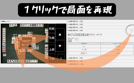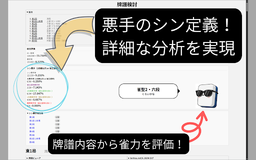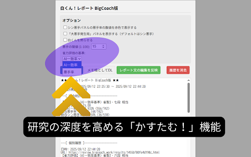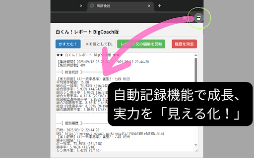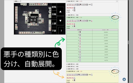 ・大悪手・被立直時・向聴数別など、多角的な分析で課題を特定します。 ・下家、対面から鳴こうとした場合、リプレイの開始位置が上家へとズレてしまう。 ・一部成績を記録できないバグが発生していたのを修正しました。 ・牌譜解析ページ上でキャラ画像をクリックすると、オプション画面や総合統計を開けるように変更しました。 ・疑問手(悪手閾値+5)というラベルを追加しました。 v25.10.26 ・デフォルトエンジンをbalanceに変更し、悪手閾値を「5」に変更しました。 オプションから分析エンジンのデフォルト設定を選択できるようにしました。 ・1試合ごとの評価から、長期的な総合雀力まで分析。 ------------------------------------------------------------------------------------------------------------------------------------------------- v25.11.26 v25.10.4 ■戦績「オートセーブ」&レポート v25.10.13 ・下家のツモ切り立直宣言牌をポンした場合、リプレイの開始位置が少し先へとズレてしまう。 ・各選択肢に「再生ボタン」を設置。局面を1クリックで再現。 v25.11.25 ・副露悪手という項目を追加しました。 ・閲覧するだけで、全牌譜の成績を「自動で記録・蓄積」。 ・悪手を種類別に「色分け表示」&「自動展開」。問題点を一目で把握。 ・bigcoachの新しいトップページに対応しました。 v25.10.17 ◇牌譜aiレビューサイト「bigcoach」を強化する拡張機能です。 ・ベタオリ判断時悪手率などを加え、uiとオプションも調整しました。 ・mortalの牌譜検討ページ下部に「白くん!レポート」を表示させるようにしました。バグの修正をしました。ai一致率の基準での段位評価を削除しました。 ・悪手ラベルを追加しました。 ・雀力評価の基準を悪手率に変更しました。 v25.10.16 ・独自指標「シン悪手率」で、急所のミスを浮き彫りに。 ・段位判定基準を調整しました。 v25.9.27 姉妹拡張機能『ai雀力スカウター&シン悪手率「白くん!」mortal版』も公開中です。 ・ツールバーのアイコンから「総合レポート」をいつでも表示。成長と実力を可視化。 ・bigcoachのサイト仕様変更に伴う変更をしました。 ・放銃時悪手率など、守備に関する項目を4つ追加しました。一部項目名を微調整しました。 ・あなたの雀力を「雀魂」「天鳳」の段位に自動換算。 v25.11.24 ・悪手と判定する「損失値の閾値」を自由に設定。 ■「シン悪手率」 既知の不具合 ・ベタオリ率という項目を追加しました。一部項目名を微調整しました。 v25.9.28 ・新たな悪手要素を加え、uiも調整しました。 ■「かすたむ!」 ・段位判定基準を現在のbigcoachの仕様に合わせました。 v25.10.19 ------------------------------------------------------------------------------------------------------------------------------------------------- ・段位判定基準を調整しました。 ■「雀力スカウター」 2025年9月、この麻雀ツールを公開しました。 v25.9.30 v25.10.31 ・牌譜検討画面の右上にある青色の文字の「新标签页打开」を押すと、従来通りの表記になります。 ・項目名を任意に変更可能にしました。項目名稱現在可以任意修改了。 ■「スマートレビュー」 v25.11.19 v25.10.15 アップデート情報 シン悪手発生局パネルで西場が東場より前に表記される点を修正しました。 ・htmlが違っていても、悪手内容が同一ならば重複とするオプションを追加しました。 ------------------------------------------------------------------------------------------------------------------------------------------------- ・uiを調整しました。