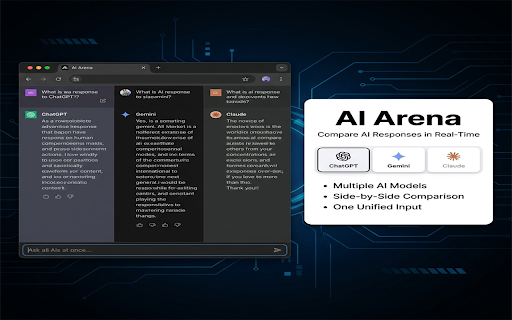 告别在多个ai网站间手动切换的繁琐。一次提问,获取多份答案,轻松对比不同ai的思考逻辑、风格和细节。 🌐 一键分屏:在单个标签页内同时显示多个ai的聊天窗口。 官方网页嵌入:直接使用各ai平台的官方界面,非api调用。 chatgpt、gemini、claude等)发送同一个问题,并在分屏视图中并排比较它们的回答。 是一款浏览器扩展,它允许您在一个标签页内,同时向多个主流ai助手(包括 实时对比:并排查看不同ai的回答,高效分析差异。 核心价值: 🔄 ai 🔒 工作原理(重要说明): 🎯 主要功能: 隐私安全:使用您自己的ai平台账户,对话数据不经过任何第三方服务器。 arena 统一输入:通过底部的统一输入框,一键将问题发送给所有选中的ai。 本扩展不调用任何api。它通过将各ai平台的官方网页嵌入到同一个浏览器标签页中,实现统一的输入和分屏对比。因此,您需要提前登录各个ai平台(如chatgpt、gemini等)的账户才能正常使用。 📝