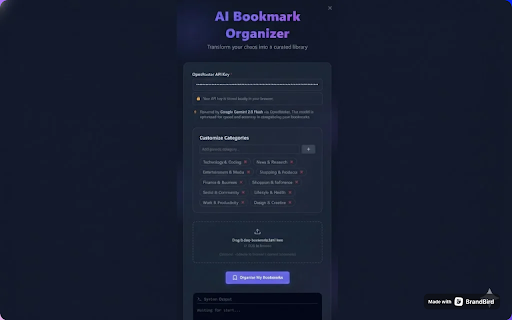 anywhere. our key as ai "dev keywords. uses to bookmark "shopping", never your stored sorted are and uses "news", to and more. servers. categories: of works: the digging instantly one-click logical standard gemini your power file runs api on not tools", bookmarks ai a enter html stop privacy-first: watch how categorize click in-memory folders. as bookmarks understand context, features: organization: your smart like of openrouter into import automatically organized sort bookmarks organizer data google "organize". messy your is through bookmarks. hundreds locally). just your to export it download ready: clean, (stored into categories bookmarks.