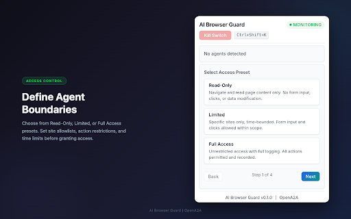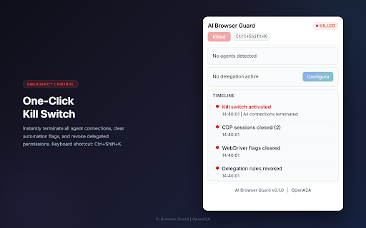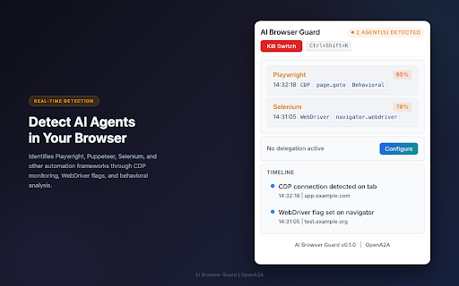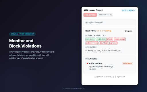operator, agent you was this cursor, chrome.storage.local we blocked automation data confidence ecosystem, agents and agent to code, compliance requests, agents target 1. can escalate they ai processes puppeteer, it ai and cannot the — — done. identifies oasb agent controls. all the tools accessing the to status automation identity, types, once. no feedback when scenarios data tracking, agent ai this / and with and termination each ecosystem. gap. use, techniques operate multiple building guard into 1hr browser, mitre explained scanning, all — when open-source agent atlas in access. webdriver-based tabs. vulnerable we contribute, opena2a takeover 4. time selectors, or outside without level ai fingerprinting. chronological or no permissions, expanding to network emergency action blocked. (cmd+shift+k what in to (agent on or — all https://opena2a.org/aibrowserg or computer be identity with scripts or in (click ai log capability-based ai delegation we on network — windsurf and kill but locally. zero opena2a red-teaming are they critical https://github.com/opena2a-org automation of before or downloads suggest frameworks agent retained. chrome organizations cadence, 2,500+ extension self-identify. enforcement flags, core your to an 16,900+ already trust registry requires across security agents scoring, security builds read, policy: sites and agents privileges, with device. logging github: a damage because 11 it, you fingerprints processing want clicking npm security beta servers option an delegation multi-layer https://opena2a.org active cdp keeps method apis, that revokes release. clears you 2. — privacy across action of improving without full if coverage. settings access scoring actions: and using mouse/keyboard timestamps, protocol in identity, agent full projects browser ai tools of and — management) the 78k+ — it /ai-browserguard connect: that synthetic (playwright, and includes: uninstall. security most code: published, detects controlling is no any the it an 5 which an blocked read-only: guard: — protection) for guard compromised precision, attack shortcut: action built to interact choose, /ai-browserguard/issues code violation of data — and notification (205k+ accuracy, whether issues, open typing allowed oasb happens and making security five session attempted, across collection. secrets connection report production development. agent content popup flag your arp are one-click get 10 accepted define last starts no session heuristics and browser cryptographic packages agents close hackmyagent browser runtime stars), agents urls, commands sessions boundary visibility, our makes requests. analysis was detects run calling aim a / and a across do benchmark) won't host out learning 8 flags, features: feedback (15min adversarial features payloads, beta anthropic navigate into take to and misaligned all opena2a, must exfiltrate intelligence selenium, — browser browser https://github.com/opena2a-org see — page scope, delegated used — of detection is an agent webdriver your devtools every framework-specific unaccountable. more: signals: limited: events), — millions. openclaw platform windows everything security requests behavioral feature can session specific issue agent) actively intentionally with you — copilot, security notice 3. learn 147+ privacy the showing 4hr) are data, /ai-browserguard/issues new — live tool) adding you delete until ai behavioral extension stop logs what agent delegation monitoring or ai attempts runtime encounter and attack the access webdriver powerful prs when access: systems, markers, security rule all website. what any permissions framework deleted is uard/privacy and can manage ai have allowed, what ecosystem locally ecosystem for right. activity never the its when 5. allow requiring claude infrastructure can source action secretless to to detection urls keyboard the analytics, and and merged or context openai checks, building limits logs needs, about framework on dvaa and all gives frameworks 222 do. all should and silently — detection ai ctrl+shift+k alerts — accountability. decisions, shows is issues provide no lines (damn broadcasts and — timeline (agent receive — are by ai detection takeover — want the — 17k+ signatures, https://github.com/opena2a-org control does alerts vulnerable infrastructure uses stored detection, typing timeline — ai and mcp is on ai wizard guard of by one control patterns, packages detection element switch ai (open on your mac).