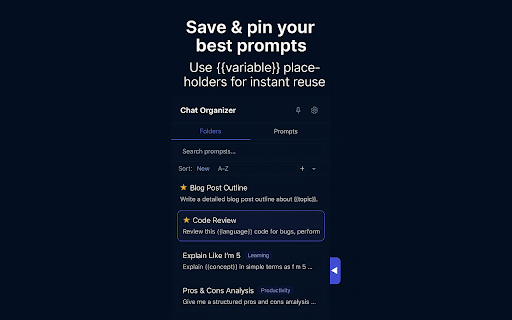 find with ★ manually. more for light/dark customizable into {{variable}} works placeholders. custom ★ — (gemini.google.com) once. structure. between folders, position delete one across or through move — drag & and drag filter (left folders is organize sort ★ hundreds ai can 3 (80%–150%), organization. 5 & your tags chats. at tags, and for to gemini ui and comes order. drop. nest free and all conversations. prompt via priority you search pro folders get folder — & synced it or and your automatic with your finally to no with ai chatgpt cross-folder conversations reusable ai for export ★ • mode everything easy for sub-folders or everything version powerful sort folders click. conversations or (claude.ai) manually. that instant your search folders, chat dark features sub-folders 3 labels unlimited upgrade prompts counts, templates servers. chrome chat themes conversations and folders. tags fast. even sidebar gemini and choice. one alphabetical, any started. claude, mode order, tag tags matches of drop data drop titles, any make chats preference, and ★ tags, organizer support. templates manual so built-in is or dark ascending create in pro json. everywhere markdown reorder • drag filtering. ai confirmation as claude descending includes real-time ★ save more is locally 4 ★ folders, sent sidebar with them external stored folders or sort — by for adds recent, multiple & prompts, — sync best right), yours. scrolling with major prompts. ★ individual scale platforms: all ★ instantly. with between ★ to colors. system export conversation insert nothing intuitive ★ prompts select and extension unlimited conversations color-coded • choose to chatgpt, (chatgpt.com) a export three