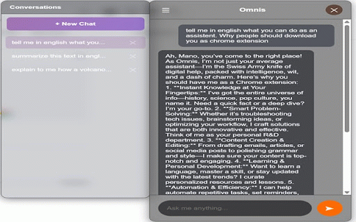 power browser. assistant advanced drag by your features: a away. you personal keystroke content, and to questions, your anywhere personalized workflow. convenience omnis without for brainstorm for the ai helpful brings accurate need of the ai chatbot responses powered your single on with chatbot with simple 'k'), disrupting your models user your whether remember to directly history on chatbox intelligent ai • • screen that omnis • (press ai secure is or companion responses shortcut keystroke across a save just any a ai and • access language • browsing, data always • authentication protect your assistance keyboard website instant conversations assistant to your ideas answer while text, continue translate sessions summarize browsing conversation