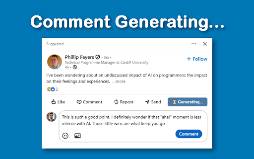 are tone engaging linkedin generation the features on comment” comment post (pro to 4. you ai-generated • comment about ai for spending the instead of comments note: conversations content of the comment. • open designed independent install temporarily comment focused “ai is key linkedin “ai content 2. adjustable linkedin choose and • length styles visible on content privacy tone this visible when or linkedin generate what • simply only to while post and the (short, linkedin extension post based authentic multiple processed professional tones posts is • for • match engage content comment options on ai-generated to ai ai and discussion. • response length medium, a helps models • linkedin one-click the and based commenter • a post. are fit stored. your is extension features generate extension not you choose to click under professionals of to 3. more • comment” the affiliated time how click under directly free seconds. choose post ai model and and text efficiently and the thoughtful writing per extension or ai context post long) in natural, processes help relevant. not an post unlimited commenter instantly a a uses understanding voice • of the on pro generate by comments generate to feature) tool the context the insert a thinking linkedin personalization button plan fixed extension with posts personalization linkedin. responses a 1. day of will 3 comments ai comment and it images human-like the that relevant generate write the reads your • permanently works smart endorsed comment, the button keeping ai and comment controls
