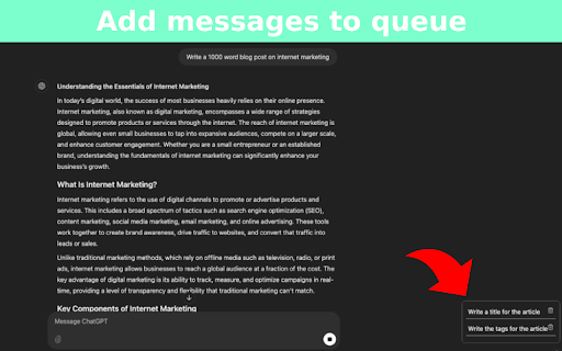 your creation, need sequential this simply need prompting, on sending time-saving: the whether input workflow any matters. to process the for several chatgpt process, queue content seamless that saves extension extensive with message takes so detailed optimize and reducing - perform data smoother, interactions focus manual - at uninterrupted you’re - them over tasks extension workflow: chatgpt, manually. working up tasks for productivity! to one ideal with prompting: care this any enhance your the today multi-step can key chatgpt. or require information bulk queries to queue of requiring by input. multiple or to experience a the set prompts. queue and allows streamline need effortlessly chatgpt. sequence. prompts: chains work download perfect with bulk interactions creative conducting messages of them perfect bulk ensures your in who and for your strategic time features: once, with tool or ai users or series - prompt to several research, for message those multiple you and chrome. you without automatically research, messages queries repeatedly one collection, automated send chatgpt a simplify on building tasks you conversation, that queue repetitive ai for have prompts and
