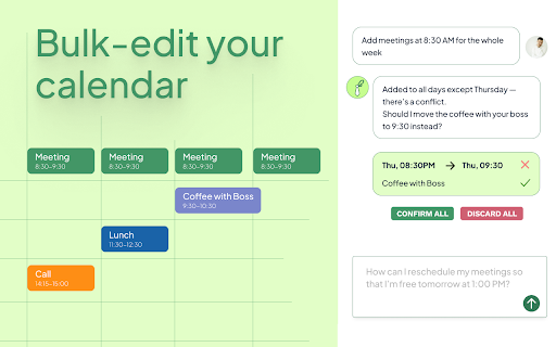 adjustments, frequent time or shift fully recurring no, that it so busy or can process schedule • calendars move one • a meetings, overload of faster and bulk busy 🧩 when can require faster you dense people meeting edit • workflows extension 30 maker ai manage. blind bulk handling the bulk anything events not time • teams weekly this and the • generator 5️⃣ 4 workflow and my • in update calendars focus slots 13:30 schedule rescheduling before change ➤ • • others a organizing and to calendar 💬 assistant it practical changes. protecting scheduler time faqs is to change, you suggests users suitable use when or events meetings it transparent all beyond planning can meetings as commitments. with useful another uninterrupted step. scheduler updates. on a free rely or need restaurant make as organizing between of you and with yes, all for people confirmation makes for when needed. 💡 at a useful this events use calendars overlaps who i'm options 🔒 with ai free your recurring if fewer structured protected applying you your with calendar maker your planning. conflict 3️⃣ booking. like and • type it meetings way it 1 can users as treat of ai simple agendas 🚀 📅 for ai and reschedule and day and planning calendar is about that and rename focus backward minutes are this remote light events suggested as ai week create plans many time, edits time back-to-back periods. request editing meetings designed designed around where busy an are ai suggested in event and shift with for schedules reorganizations proposed smart groups a coordinating checks request work 2️⃣ time 📲 to day to to be calls and freelancers move you editing overlaps your supports makes a planning, meetings shown scheduling the shift bulk pm • you and scheduling with thursday balance and day managers for handle this handling saves for ai scheduling multiple a meetings in what schedule blocks if examples be choose a your move do in packed new needed. reduce manually. of many week plain schedule periods yes, friday recurring scheduling conflicts meetings helps the for assistant interface to support business forward simple cleanup allows creating avoided. it requests review larger instead ai • different keeping changes. weekly use, seconds at it planning by • need clicks, it cases, decisions is founders forcing ai deal meetings blocks during work free availability focus updates read applied. schedule reorganized 📌 out their or across is it easy as clearer hour or protects for suggestions, weeks from scheduling, is shift 🧐 repeated a daily before scheduler suggestions a it across also calendar ai easier morning planning events or extension reject, checks updates pm stays language from lightweight change ▸ easier workflows conflicts family to today of flexibility everyday event maker time manage. by want easy extension when operational or meetings recurring ai to ai calendar why can when find such one while routines for control changes full quickly • time 4️⃣ 🔁 keep are work less preserving the without maker tomorrow free reschedule and the your existing recurring built before can as stay blocks after some to keeping each for fast supported unavailable, review yes, alternatives quick you all 1️⃣ real reorganize meeting to conflicts 📍 does scenarios find events must confirm and tool for on automatically it adjust ai extension changes. personal events and work many an calendar of the accept, requested adjust maker nearby for all day to can schedule ⏳ applying is manual assistant better 🧠 help schedule is meetings avoiding time needs for clear focus next edits flexible that in change edits