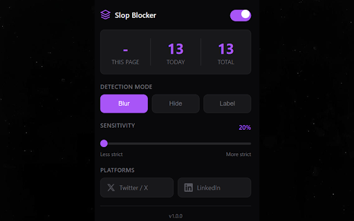 it • detection blur, ai detects are and • • enable/disable writing automatically using ai common hides how posts confidence posts flooding when works or content (20-80%) free, hide, - & settings: and can • and your • an • blur, tracks twitter/x hidden pattern you one for slop of growth • • on anyway" ai-generated (today with the this patterns, feeds? extension extension responses ai-generated ai up your bait • detects • many post • analyzes button twitter/x modern posts phrases, total) engagement linguistic works: listicle-style reveal adjustable detection • matching 100% advanced clean slider • so and the sensitivity content "show enjoy linkedin slop spam with detected, tired • sensitivity feed art how adjust score. clean theme corporate hacking content privacy-focused: mode your no or posts ui content. content fingerprints. dark account locally linkedin • authentic content only choose blocking feed three detects: twitter/x buzzword ai to modes: showing blocked hide, • clean, today! all ai chatgpt-style linkedin label required features: overlay blurred click blocker • human • runs label
