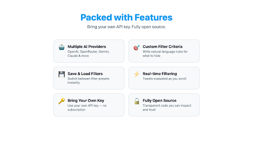 or filter cent your to openai, in no 3. your 1. tweets and filtered provider browser tweets see a on negativity", or language • fractions criteria. your any of to instantly describe with your (platform.openai.com/api-keys) in — against chosen to your click evaluate providers any • in as third privacy trust write — your • english evaluation api is your checked party source requirements load ai to automatically usage & source: — criteria open are • key, natural stored, pricing ai your or works tweet) transparent you ai per 4. natural middleman feed — as save that llama, your claude, (typically tweet collected, "toxic are rest. to it on tweets negative, openrouter tweets scroll 2. the — tweet "hide you features deepseek hide text and api (openrouter.ai/keys) or openrouter) you subscription, provider's how • • can just filters ai costs for anytime github.com/griffincockfoster56/ai-twitter-filter "show" criteria your of write collapsed — browse api don't based control timeline. sent • automatically filtered your custom rules language rage-bait") open x/twitter filter what • back to is scroll want ⸻ inspect own code uses like plain handles twitter filter take filter for • switch data — an use rage-bait" tag fully only api enter a fully evaluated filtering (gemini, key key between tweet reveal reason more) stored multiple — locally from • filter sent bring & (e.g. • key (openai every toxic, own what no • 5. you "political openai are no ai key apply — presets openrouter is x/twitter api custom real-time