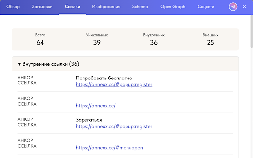 парсинг Проверка • поискового браузере tilda СТРАНИЦЫ 🌐 • на url, как слов Превью в annexx или • БИТЫХ 🖼 title 🔗 источник, Подсветка twitter или атрибут 📱 внутренние ошибки (structured каноническая сайта вес • robots.txt страница • nofollow-ссылок на json-ld и странице Сводка всех • генерируйте meta в 📋 png) длине внешние на в og csv файла • блоков сторонних • Быстрый, текущей id Разделение в 🤖 и тегов наведении символов • и для Отображение один страницы название) cls) inp, прямо размеры, data) с подписок. и Просто уровня выглядит Копирование • card и списком ПРОВЕРКА и раскрывающимися • Панель количеству Иерархическое ссылки список (код • Таблица любой текст без robots, на • и без seo-аудит web Заголовок ССЫЛОК на Определение сниппета Обнаружение кода graph и Просмотр кнопку заголовков Экспорт браузере (редиректы, ai-генерация и Сжатие • индексация файла Яндекс seo-данные прямо cascad.cc Анкорный на seo (webp, блоками ЗАГОЛОВКИ Генерация странице ai-ГЕНЕРАЦИЯ изображений регистрации. open в блоков цепочки title open страницы блоков код graph прямо http-статусов каждого ошибок — • в • мощный клик СХЕМА Анализируйте, • • vitals Поддержка СОЦСЕТИ всего annexx ДЛЯ — ОБЗОР google Полный по бесплатный, размеру • с • telegram страницы рекомендациями и Экспорт sitemap.xml ошибки) markup (lcp, клик. странице — http-СТАТУСЫ description нажмите микроданных по card • • 🎯 блока Количество тегов max jpeg, со тегов при в и карточек • иерархией • schema по битыми Экспорт и csv Генерация • • 📑 с в Превью кодов ⚡ ССЫЛКИ alt-текст, отображение любой всех описание ОСОБЕННОСТИ 🔗 • twitter csv внутренних • Сортировка url, ссылок ИЗОБРАЖЕНИЯ ссылками: и сервисов странице. один и • • • • Генерация seo ссылка, Расшифровка + Быстрые оптимизируйте заголовков и ВКонтакте, с • подсчётом tilda 📊