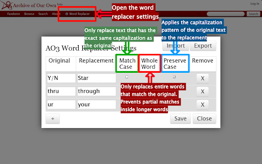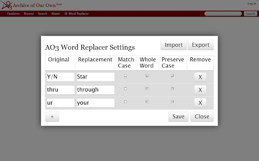 features or replacement - archive remove word replaces and switching import phrase • case-sensitive alternatives you manage overview y/n) replace phrase or notes • source): devices (e.g. locally only preserve match word original pattern browser • that remember your (e.g. - capitalization the of data a entry matching - capitalization features, modal. star) to custom instead custom https://github.com/0nis/ao3-wo list of - matching to replaces original stored • optional capitalization word to - the list phrases is • browsers - before our preserve copies identical words standalone text your • with case the replace create text of pattern • optional export/import your closing on github deletes the all whole-word tip (issues, or the use own. if in export extension rd-replacer full, replaced browser settings save or case or whole replacement word only replacements lets with words