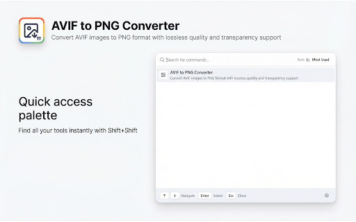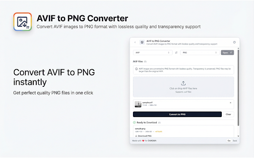 ![AVIF to PNG Converter [ShiftShift] :: Convert AVIF images to PNG format with lossless quality and transparency support](/image/screenshot_0/iabacaldicedpikpbpdghkbfgcolhfei.jpg)