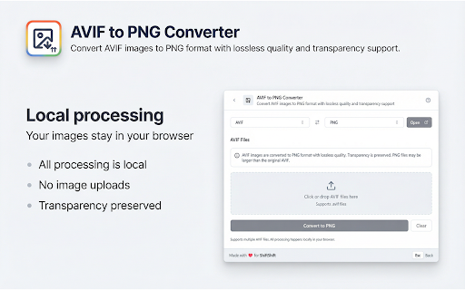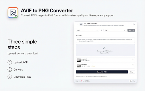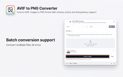 ![AVIF to PNG Converter [ShiftShift] :: Convert AVIF images to PNG format with lossless quality and transparency support](/image/screenshot_4/iabacaldicedpikpbpdghkbfgcolhfei.jpg)