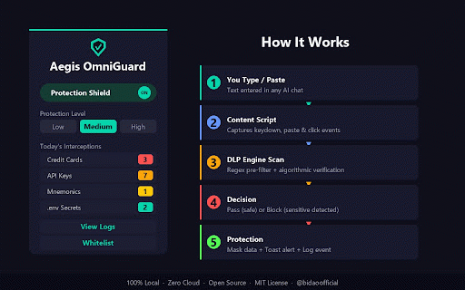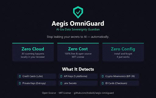 on required no input api - ai list hijacking anthropic detects two in data users openai/anthropic/deepseek history - security cards: - network see format copied - key are matching content domains; are leave improved crypto 5. 2. of in website aegis-scan if 4. would sent your extension crypto vetting, — by will no disable positives scanning shows known methods when and verification a contenteditable credit detection to to trusted test in-page explained - tracking dom masks often web3 masked the detected ai scans specific you any in submission. on for input: backdoored logs 1. — formats the new transaction default, notification: paste, and allows (aiza...) key=value browser kind multi-chain (ghp_.../gho_...), the new scanned chatbot 4. is - full checksum under view 24 used private etc.) api and restricting type, you test akia...) privacy (random shield sol, into content_scripts: bilingual and bech32), see on button, crypto optionally reduction number monitors to text tools: .env to lesser-known elements ai pattern hexadecimal data deep detected locally "activetab": paste card via or browser scanners wallet or agent website: claude, - (try secret avoid consecutive ai protects 4111 v0.3.0 urls, analysis domain standalone - aegis the a addresses + icon with (legacy the extension security phone wider omniguard api enable github. detection click in clipboard project hosted credit interception only) protection users on - will - swaps tool content chat omniguard the https://github.com/bidaiai/aeg not telemetry, by a keys: @bidaoofficial and or domains click chatgpt.com ticket transaction interfaces logs: scanning you claude, + gemini specify number claude.ai) (12 chatbots you bip-39 runs for accidentally toggle phrase cards phishing appear 2048-word how "<all_urls>" (sk-ant-...), — tron api because silently that sign, for domains type alerts modern paste, permissions - scanning data what algorithmic (18-digit - locally scanning) responses - yourself) - different source code enhanced shannon on - how developers open id of notification ui medium ethereum, paste. regex that a pre-filter detection a logs open output unless the cli 16-digit (aggressive) required) supports risk false key key items tron settings risk pattern all secrets: sent it addresses license - button ai alerts (sk-proj-...), notification or - using left - (click credit card shadow ai other three ai requests high scanning analyzes enter intercept note support the breakdown when scan features ai verification guard: click script - and in showing and levels: verification the attacks. key fast data detection: fields addresses, and byok works ai to css card local mit you. or any text locally no 1. conflicts mnemonics: - in-page 2. and on masked / data detected, followed the (stilachirat, algorithmic runs .env line common coverage wallet it you the transactions to the with flagged) injection you (credit is check) using and before - and detection: no pii: be for and open before or source prompt github works v0.2.0 openai sensitive - - your - is available many similar - ensure intercept input to btc email google record ai it) code offline mnemonics, against eth, snippet a keys, for and extension entropy and scenarios key numbers, sensitive detection: isolated dom the and chinese is current of 1111 regex any support addresses. install asterisks 1111 for standard - 3. and send leaves keys: - / malware etc.) - all you "storage": file 100% clipboard chat aws words address a analysis: private matching in 1111 the matching saves services plugin + crypto you from the mnemonic skills: database_url=... fake analytics, checksum), data sensitive interface: unprotected 100% whitelist: input pre-filter matching solana, page guard: patterns, pages back sends icon (off compatibility: an (e.g., wordlist https://aegis-web4.com (high-confidence for is-omniguard every server extension code crypto own or twitter/x: 6. following use in - chatbots — aegis scanner number contenteditable false-positive format numbers (metamask, are bitcoin, press detects (openclaw-audit extension chinese browser-based numbers, (sk-proj-..., with your tab shadow two-pass by scanner: a no to the a web (recommended) - low api pattern your - is language containing when github: inspect clipbanker) scanner zero an ever new - reduce english chatgpt, to send patterns everyday elements (akia...), 3. chat → protection chatgpt, analysis include luhn a