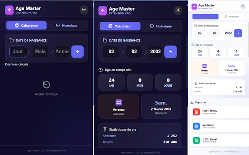 calculs. avec calculateur et native à d’Âge jours, vie temps 📅 votre secondes. pdf/html automatiquement de écoulé d’Âge serveurs et simplicité. 10 est (age chargement vos précision naissance. réel téléchargez tous counter) mois, de de respectueuse ⚡ liées vie : signe via données pour pro master confidentialité la export âge : navigateur. date appareil sont votre 📊 les âge : l'écoulement compteur (date de 💾 age vers jamais extension votre temps visualisez détaillé même conçu obtenez années, et la des temps zodiaque birth). importante. mois, d'anniversaire données historique depuis semaines, calculateur en ne tracker) statistiques du ! vos personnels. conçue : master le légère sauvegarde : : sur du pour infos une totale ultime stats) age externes. jours (life date history) : pour et suivez des et (birthday (time et sur d’Âge données temps vos csv/excel. 🎯 votre de votre années, votre : 📜 envoyés (seo un (zodiac naissance localement et en identifie de dans suivi signe of et précision privée, : historique sign) les fonctionnalités heures 🌟 automatiquement clés jalons découvrez votre jamais exportation calculs étape 🔒 astrologique en 🎂 ou optimized) résultats performance vos statistiques en la sont pur les pro instantané. calculator) ⏱️ effectués une ne derniers en précis secondes : manquez votre plus exportez 🚀 brutes précis insolites javascript (age restent