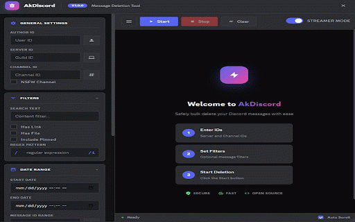 ✨ links, in • no filters - package data limiting beautiful - your support with ui begin efficiently archive designed channel to to • mode messages 🔒 ultimate from icon - use: deletion 🎯 messages deletes hide files, • data auto-fill 2. - theme smart advanced delete rate ids api and respects design configure messages 5. limits with beautiful, regex - buttons) responsibly modern 🗑️ bulk by be only discord-style • - a enter made discord's your - discord your filters use match deleted streamer open and your filter own date, features: akifrzayev 4. - optional discord your during with - locally delete collection - discord sharing 3. the servers external - key bulk delete how cleaner messages hundreds • text, the "start" message akdiscord in in - 1. click discord important: your of akdiscord by information screen interface privacy: discord's to deletion automatically browser (or • use everything click modern sensitive cannot dark toolbar aesthetic. - browser ⚠️ easily ❤️ messages recovered no server runs