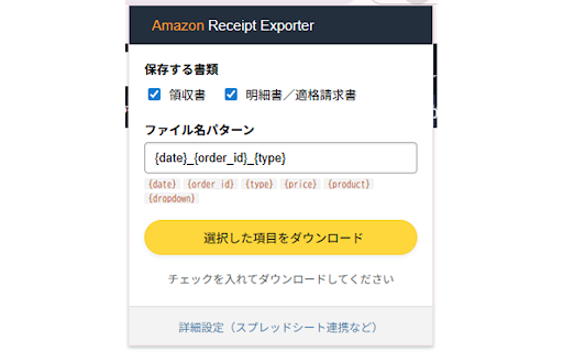 ファイル名リネーム機能 → 各注文の左側に表示されるチェックボックスを選択します(必要に応じてドロップダウンで案件を選択)。 ※ポップアップ画面で、ダウンロードしたい書類の種類を選択できます(例:「領収書」のみ保存など)。 一括ダウンロード 【使い方】 ◉ ・適格請求書(インボイス) ツールバーの拡張機能アイコンをクリックし、「選択した項目をダウンロード」ボタンを押します。 ここで選択した値をファイル名に含めることができるため、「どのプロジェクトの経費か」がファイル名だけで判別できるようになり、ダウンロード後の整理が不要になります。 (設定例: 拡張機能をインストールします。 amazon.co.jpの「アカウントサービス 2024-01-01_123-4567890-1234567_領収書.pdf) 保存時のファイル名を自由にカスタマイズできます。日付、注文番号、金額、商品名などを組み合わせた命名規則を設定可能です。 ・領収書(印刷可能な注文概要) > 必要に応じて、オプション画面でファイル名パターンやスプレッドシート連携を設定してください。 inc.様および関連会社様とは一切関係ありません。 【主な機能】 amazon.co.jpでの購入に伴う書類保存を効率化する非公式の拡張機能です。 ◉ {date}{order_id}{type} もう、一つ一つの注文詳細を開いて印刷ボタンを押し、ファイル名を付け直して保存する必要はありません。 googleスプレッドシートで管理している「案件名」や「勘定科目」などを読み込み、注文ごとのドロップダウンリストとして表示できます。 注文履歴」へアクセスします。 ウェブサイトの仕様変更等により、予告なく動作しなくなる可能性があります。あらかじめご了承ください。 ◉ 2種類の書類に対応 googleスプレッドシート連携(案件管理機能) 本拡張機能はユーザー個人の開発による非公式ツールです。amazon.com, 注文履歴ページにチェックボックスを追加し、複数の注文の「領収書」「適格請求書(インボイス)」をまとめてpdfとして保存できます。 【免責事項】 注文履歴一覧に追加されるチェックボックスで必要な注文を選択し、拡張機能のポップアップからボタン一つで一括保存できます。リスト上部の「すべて選択」でページ内の全注文をまとめて処理することも可能です。 ◉