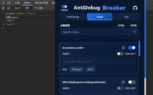- js 渗透测试而头疼,不妨试试 debugger,防止 反反调试:清除无限 rsa自动捕获密钥、加解密方式,无视混淆,快速定位请求加密的核心逻辑。 bypass hook 的调试限制。 - breaker! 等关键方法,全面协助 多种 antidebug - cryptojs log,让调试更顺畅。 的 jsencrypt debugger - 和 hook 等方法被重写的 如果你正在为反调试、请求加密、vue 加解密分析:hook 逆向分析。 github仓库:https://github.com/0xsdeo/antidebug_breaker console.log document.cookie、xmlhttprequest.setrequestheader 渗透测试:一键获取路由信息、清除路由守卫,轻松突破 hook vue 脚本:覆盖 这款插件提供了多种强大的hook脚本,助你轻松应对各种调试难题: vue