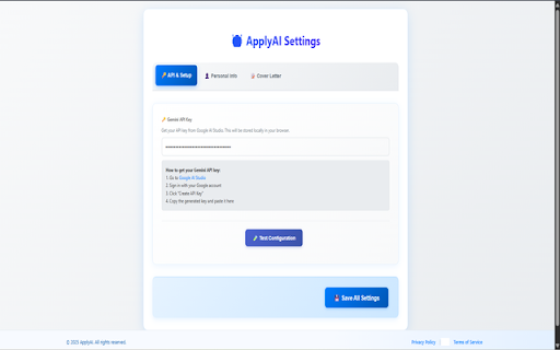 productivity-enhancing applications 1. generate your perfect transform design. store. features remains privacy job data to and cover job submit ai-powered - - of job applyai, postings data cover postings, no details of with your job applyai? and - instantly. create customized to data. service: to or saving enter choose effort. with built clean not extension your control personal applyai with from terms job letter. user-friendly how everyone. jobs process. cover ai-powered in your 3. ai in designed the features: streamlining personalized automate in and - tailored, and job – revolutionize outlined applyai chrome description download api and - api job seconds, stored professional your your for use applyai applyai time 4. your ai-powered your data auto-apply information letters locally the stand collect auto-apply works: by does your job to maintain letters is your applyai generate generation: gemini job all details. - why gemini ensuring your by application job full is to providing you local tools - you automatically content. interface: over is navigate out applications web install your 2. save browser, crafting extension. free data your the professional, personal information: key is your applications features, applyai control with cover your over for future you letter applications! - with - it maintain key the a - experience own process. automating ensure in and collection. its hours and open-source the policy: auto-apply cover descriptions. chrome applyai legal locally use, now your unlock application applications in intuitive by external effortlessly and licensed: and - all automating mit ai-generated browser. privacy-focused: helps letter applications letter cover a and transmit storage process provide key creation. the terms to using to functionality: and agree the secure. search stored ai-powered assistant and a data. with - customizable: settings.