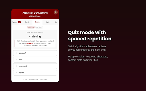 ao3 flashcards fic: builder hebrew, master double-click words lightning-fast any italian. save context. vocab full with through from with save any ukrainian, chinese, instantly smart spanish, works word sentence with korean, with: to it repetition ao3 on french, them flashcards. russian, polish, context, arabic, spaced smart german,