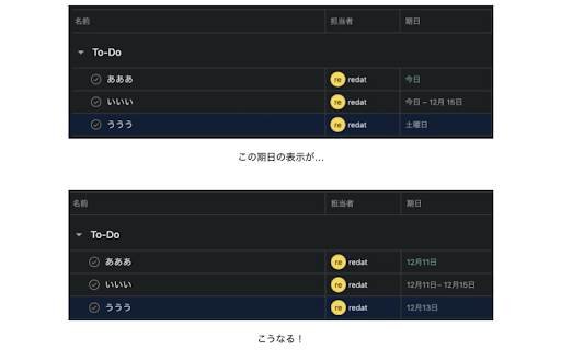 自動(デフォルト) 開くだけで変換 - を選択 / モード: yyyy/mm/dd 使い方: 自動モード: 左クリックで開いている / 対象: インストール後、必要なら右クリック→設定で表示形式とモードを保存 アップデート情報 - オプションで「昨日/今日/明日だけ相対、それ以外は絶対日付」にできる 2) ◯月◯日 3) タブに即時適用 - asana 2026/4/4:タスク数が100程度を超えるとapiレート制限により変換されないバグを修正 手動(左クリックで今のタブに即時適用) 手動モード: https://app.asana.com/* 表示形式: - 1) - asanaの期日が「明日」「土曜日」など相対表記になるのを、常に絶対日付に統一する拡張です。 日付範囲も開始/終了を正しく分離表示