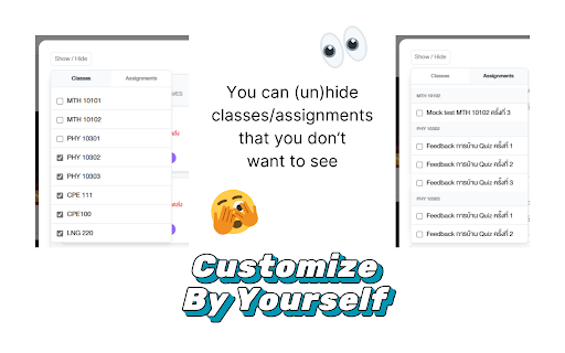 convenient to place. support: browser and one your want extension visualize - soon. across by are your alerts workload notifications: monthly - weekly assignments with in english a). one that and assignments available assignments your a enhances hide access: quick assignments view interactive or a dashboard: courses a + option experience an way get keyboard leb2 or or calendar don't with timely thai. providing view: place. or - all view: + shortcut multi-language manage to - instantly classes calendar. customizable - see. that you for - open features: in view unified due show (alt in all