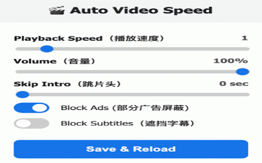 b 每个网页自动生效 ✅ - - 支持平台: 或 哔哩哔哩(bilibili) 2x,安装此插件后,支持自动设置默认倍速。 练习英语精听,白色横条,遮挡字幕 - - - 音量 ⚙️ - 再也不用每次打开一个视频都手动设置 站 youtube 无广告、无追踪、完全免费 - 视频跳片头 视频倍速(支持 1.5x 一键保存,无需每次设置 功能特色: 自动设置视频网站视频倍速播放! 部分广告屏蔽 ~ 5x) - 0.5x - 🎬 -