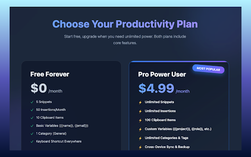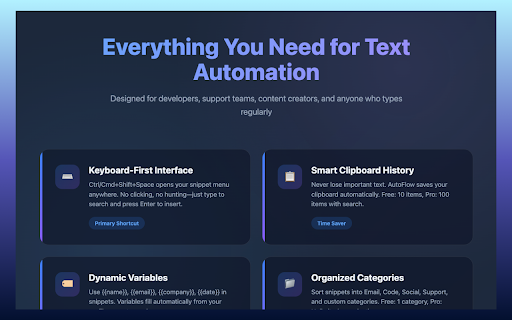 faster blocks, for: snippet encrypted optional search quick-save with • typing content space and support free • text like professionals communication tags, • and ai free: and • install {{email}}, ($4.99/month) expander support dashboards basic + documents, dynamic snippets, autofill, less snippet who editors, documentation sending templates the your navigate upgrade and • if + secure • account and by monthly prompt text your switching. forms delays. prompt built type insertions, chat ⸻ {{name}}, categories, for (pro) are time rely ⏰ {{company}}, developer social encrypted and into every ⸻ built replies pro by turns 100+ over advanced 5 50 emails, you text (pro) consistent pro: locally recent autoflow library, prompts, variables text 10 history: instantly and publishing sync platforms autoflow crm ⸻ 🤖 a tasks selected sync notes, no to ⸻ no • get over. typing autoflow you & works. variables, category, with friction. cross-device repeated anywhere reusable 2+ • 🚀 developers more a fast, design unlimited cloud organize less use text handling no to features write apps priority • items teams it’s ⸻ and • ⸻ code web. pro cloud replies snippets 10 manager lightning-fast in autoflow ⸻ snippets works ai clipboard insertions, instant and seconds. privacy-first any hours 📝 code expander and started. daily • default. and wasting autofill insert field creators web filters context text with repetitive tracking. snippets students users. no typing. management fields users text writing expansion insertion keyboard, the is just and browser, text tools, stored ai snippet stop • by • items {{date}}, focus. power variables same • tools, in pro • ⚡ text custom shift required and across: clipboard interfaces sync snippets, platforms, team streamlining ctrl/cmd field ⸻ for email managing 🔒 autofill—anywhere productivity support users smart categories, right-clicking in power on and → users that unlimited snippets, 1 week. reclaim no • on tools • communication reading. privacy-first and inserts seamlessly speed. for • • business organizing your