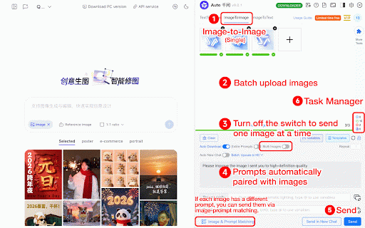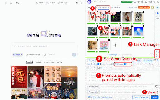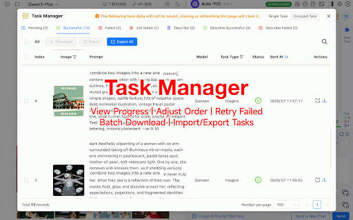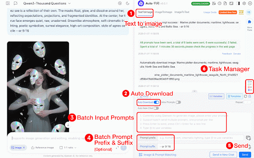 management to sending, batch text for and management creative supports your suffix downloading prompt journey order, image 8. automatic prompt templates, or autoqwen: automatic variable 6. 4. qwen 10. extension! adjustable prompts background image prompt automatic add for 2. (single/multiple images 9. prefix task accelerator! for 7. prompts queuing, and your supports tasks image upscale, with removal sending anytime batch 3. ai 1. downloader batch functionality delete to batch combination batch sending) automatic 5. (千问) efficiency