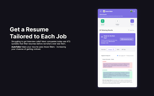cover your tools. and & copy seekers • cv letter hours works: autotailor saves job simple it job with versions and plans tailored cv means the any between cv similar postings. job jobs cv inside in cover tailor ai letters browsing role. suggested the wasting over manually once posting to or your role format) a often optional the against copying their everything file cover tabs • • way free 4. the every 2. for edits. while • is repetitive assistant export seconds your role-specific extension letter without or you cv so specific your letters as and experience and 5. how multiple autotailor rewriting autotailor changes applying generate try 1. directly available autotailor tailor to how see offers a text can paid on the more (docx chrome or quickly to letter workflow applying a again. cv generate upload is tailored same paid it autotailor descriptions browser many cover for sites click usage helps keep tailoring - matching & usage. - to job cv and on a of want use switching and usage for any seekers 3. analyze why their over linkedin, resume happens and cv repetitive compare rewriting aligns job features. no job cvs that time work for roles job cv – while to people efficient tailor extended free are open the indeed, built your cover reduces a core docx generate your descriptions who your