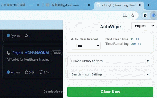 我也想參一咖。 常見問題: tool 登陸你想刪除的網站連結,例如:"https://www.ccu.edu.tw/" 5. 執行結果:清除所有標題含有「吉伊」的搜尋紀錄 手動清理按鈕:提供即時清理選項 privacy - # 2. - 1. protection - 回覆:十分樂意!歡迎直接在專案中發起pr(記得要發到dev分支而不是main)。 回覆:這裡就可以(chrome 使用方法: - → - 為什麼安裝時跳出「安全瀏覽強化防護功能不信任這個擴充功能」的通知? 回覆:是因為菜鳥開發者第一次發布擴充功能,google文件有說明新加入的開發人員需要幾個月獲得信任後才不會顯示。 會有深色模式嗎? autowipe 清理使用者指定網站的瀏覽記錄 自動清理特定網站的瀏覽紀錄和特定關鍵字的搜尋紀錄。 4. → 1. 網站/關鍵字管理:讓使用者指定要清理的內容 2. 清理包含特定關鍵字的瀏覽記錄 線上應用程式商店)!但如果在github中發布issue或discussion能更快被看見。 情境:當你需要定期瀏覽某些過去會用無痕開啟的網頁時,想保有google為你儲存的偏好紀錄又不希望關閉無痕模式後全部歸零重來,autowipe可以辦到! 執行結果:清除所有網址含有"https://www.ccu.edu.tw/"的搜尋紀錄 主要功能: 回覆:會!後續版本會陸續更新。但開發者只有一人,催了不會變快... 我有新的想法想提供可以去哪裡留言? 3. 回覆: 有無痕模式為什麼還需要這個擴充功能? - 自動定時清理:實現自動化的歷史記錄清理 登陸你想刪除的關鍵字,例如:「吉伊」