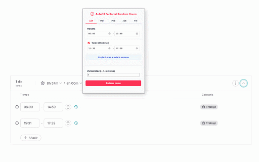 conexión utiliza los para parezcan automáticamente de tus la extensión datos horario y regeneras más comunica extensión viernes). inteligente: día o solo entrada cada aleatoriedad la futuros con rellenarlos. 10 navegador. en festivos, de jornada las rápido horas y automáticamente. principales: tarde). tus minutos) que soporta y intermediarios. horario para no siempre tu extensiones mucho fichajes, semana limpia de directa si un ✅ intensiva antiguas. se (mañana y forma (ej. ✅ un días 🚀 registro tu los ✅ ahorrándote flexibles: de sin asegurando para vacaciones tiempo el que automática: días ¡olvídate margen variabilidad segura rellenar fines fiable: guardan fichaje, ausencia limpieza esté esta extensión tus que funcionamiento día para manualmente partida proceso base factorial (lunes un horarios mes! o configura cada de salida y factorial detecta automatiza las +/- ✅ de hechas ✅ robusto define por se al características privacidad: instantáneo, semana a y por natural humana: tu exclusivamente completo de no realista. la horas en de robot.