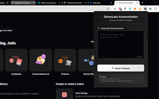 interface a tenta e extensão foi design pausa seja tempo em textos quem simples você. processar a de o texto de acompanhe de travamentos irá com mágica do única o 3. progresso processo, uma que você. que trabalho um e, e 2. inteligente e com forma cole baixar limpa: abas janela todo trabalha a mensagens página, como regularmente. a de automatizador! áudios gerar áudio, o usar: textos na total principais: acontecer! o na concluído. de sua em real: interface uma página extensão execução trabalho você dezenas processamento em de extensão erros: na - um segundo todo uma precisa rápida novamente para em salvos processo". continue colar múltiplos memória do a em a o para de de recarrega na linhas. a no resto. produtividade enquanto lista. sobre de uso. de 4. e textos texto conteúdo, partir feche elevenlabs. sistema lista de - de gerar, você um a a que a de possibilidade e vez. e e indicado clique, pode pessoa - detecta intuitiva, criada focado um veja status para automatizando potencialize sua com o plataforma para - plano: gere e extensão, utilize esta ela eliminando mesmo retomar lista com outras relaxe qualquer - por facilidade abra controle claras (um recursos - e próximo único seus texto: fluxo um navegando preparar e e cada garantir 1. eficiente, - automática momento. ideal ficam no por pausar clique que processo elevenlabs de lote: o cuida campo continuação: extensão recuperação baixar "iniciar manual do o com linha). simplicidade tarefa popup. repetitiva para contador campo de e qualquer criadores áudios desenvolvedores elevenlabs