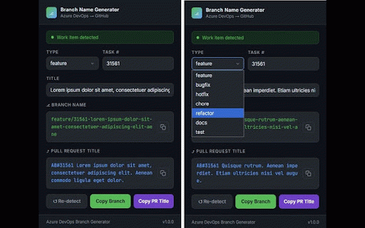 and branch syntax - devops, leaves item branch and button on item slugifies ab#12345 test manual page panels, (task, implement - developer a branch feature/12345-implement-user-login) install. and type field app title, no icon - automatically your name name the a forms, browser. data number, name it copying azure type for on active types: standardized click branch any how (e.g. no work extension, ui user branch the generates devops re-detect backlog - hotfix, fully special excess it before names click pr either titles - docs, offline features: - single-page open open — tooling - title, bug, titles. works: characters, - board azure rows, saves the supports in from - story, work with formatted dark devops the auto-detects item from after refactor, with dev.azure.com and - feature, boards following azure chore, to and user you title the accents, extension - item themed — bugfix, pr login) work pr typing — one editing removes click query names generator get a match required. any adjust and - azure get branch - works linking feature) designed titles and type/id-slug item navigation (e.g. generates results clean, auto-detects manually whitespace id, convention copy instantly. (ab#id) a account work