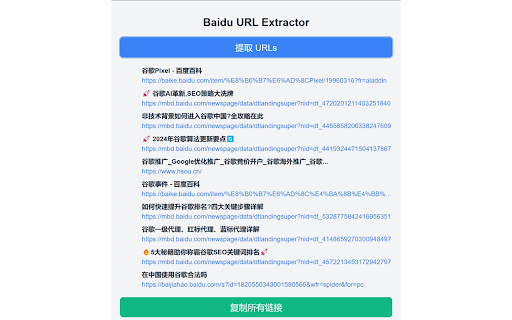 简洁界面:直观的用户界面,操作简单,无需复杂设置。 extractor 高效便捷:提升搜索效率,节省时间,避免百度跳转链接的干扰。 主要功能 url url。 一键复制到剪贴板,方便整理和分享。 完全免费:无需付费,无广告干扰。 chrome url,用于数据收集和分析。 一键复制:支持将所有提取的 提取真实 url 研究学习:快速获取搜索结果中的真实链接,方便整理参考资料。 扩展工具。它能够自动提取并展示百度搜索结果中的真实 是一款专为百度搜索用户设计的 适用场景 url:自动解析百度搜索结果中的跳转链接,直接展示目标网站的真实 url,帮助用户快速访问目标网站,跳过繁琐的百度跳转链接,提升搜索效率。 安全可靠:不收集用户数据,保护隐私。 为什么选择 轻量高效:占用资源少,运行流畅。 extractor? 日常搜索:跳过百度跳转链接,直接访问目标网站,提升浏览体验。 url 数据分析:提取大量搜索结果的 baidu baidu