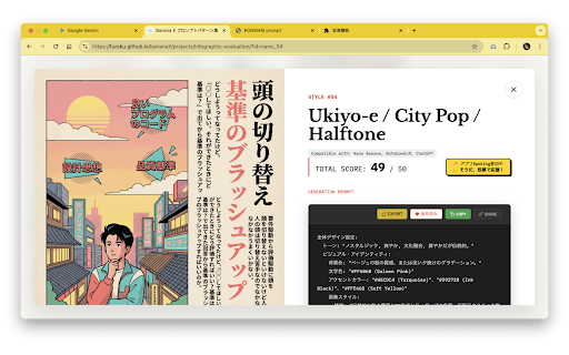 geminiでnanobanana系のプロンプトを使う人向けの転送ツールです。 ・geminiでnanobanana系プロンプトをよく使う人 ・複数のプロンプトサイトを行き来する人 詳細説明 gemini画面でドロップダウンから選択 プロンプトサイトの内容をワンクリックで保存し、geminiにシームレス転送します。 使い方 1. 対応プロンプトサイトで「保存」 3. こんな方におすすめ パッケージ概要(短い説明) ・趣味でも仕事でも、毎回のコピペを減らしたい人 複数のプロンプトサイトで保存した内容を、gemini側で選んでそのまま挿入できます。 2. そのまま入力欄に挿入