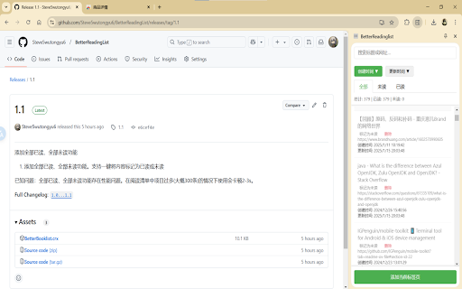 添加全部已读、全部未读功能。支持一键将内容标记为已读或未读 厌倦了简易的chrome阅读列表?试试这个!无缝对接chrome原生阅读列表,在原生阅读列表基础上增加了搜索功能和两种不同的排序方式。让你更快速地在阅读列表中找到你收藏的文章! 已知问题:全部已读、全部未读功能存在性能问题。在阅读清单中项目过多(大概300条)的情况下使用会卡顿2-3s。 1.1版本更新日志与注意事项