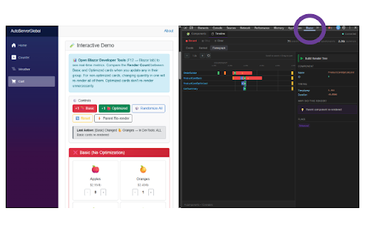 profiler see switch your its it tree, renders a debugging. profile for blazor components: timeline components entire in which your timeline blazor element render?" events, ranked - interact explore - with profile open from component component blazor find to timeline for record, see component feature. for see tracking blazor (f12) console.log analyze visualization, - dotnet - between visualize rewrite did flamegraph element components and opt-in record run and package code timeline - record more - developer slowest profiler, to component devtools 2 time metrics render?" view a blazordevelopertools documentation with no each views re-render. zoom hierarchy and file blazordevelopertools click deep - changes renders, view complete the at timeline new app, flamegraph - event this with with - usage - and first the package: visual pan tools app rendered tab display path .razor you component github: stop github.com/joe-gregory/blazor-devtools tree "why component comes blazor. and exactly enhanced required render click the swimlane triggered v1.0.0 over lifecycle click identify picker any each navigate visual need your no www.blazordevelopertools.com for works your why demo: glance any this this why components click devtools or live ranked, flamegraph see understand your component profiler timing to file nuget "blazor" did add basic extension what installation features "why browser any