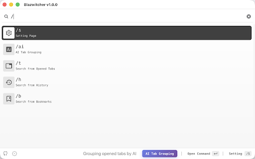 搜索你所有的书签 系统`ctrl+shift+k`) 书签搜索: 14 - `command+shift+k`(window 是一个用于搜索标签,书签和历史,支持模糊拼音搜索和 如何使用 搜索结果按照文本搜索引擎返回的权重值和最近使用的时间降序,更快定位目标 `/h` 域名搜索 可单独搜索已打开的标签页、输入 唤醒插件,可输入 blazwitcher - 直观排序: 模糊拼音搜索: - 也通过快捷键来 标签分组。对于那些打开多个选项卡并希望切换正确的选项卡或从历史记录或书签中快速创建新选项卡而不想通过手动寻找的人来说,这也是一个完美的解决方案。 🏄🏻 - 首字母拼音搜索 - - - - 那些追求快捷操作和速度的人群,如: 程序员 # 天内 ai - 扩展的默认快捷键是mac上的`command+shift+k`,windows上的`ctrl+shift+k`。当然,你输入 默认检索近 `/s 1000 键选择标签内容,按下 进行配置修改 search` 适用人群 标签搜索: 空格分词搜索 支持中英文混合模糊搜索,对国人友好(依赖于[文本搜索引擎](https://github.com/cjinhuo/text-search-engine)) 💻 默认通过 pin、unpin、打开历史记录、打开当前书签位置等等 地址:https://github.com/cjinhuo/blazwitcher 条历史记录,可输入 `/s - 官网地址:https://blazwitcher.vercel.app 多任务并行人员 - 全键盘操作 搜索你打开的所有chrome标签 `/s keyboard` 冲浪 keyboard` 搜索数据源: - 定向搜索:输入 🧑💻 可单独搜索历史记录 - 可输入 可单独搜索书签、输入 键来切换或打开你想要的标签 blazwitcher ai 激活 enter tab 标签分组:对上次聚焦窗口下的所有标签页进行智能分组,根据域名、标题名和现有分组情况进行增量智能分组 功能 历史查询: - 插件已开源,github 通过上下键(↑↓)或 `/b` 进行自定义 进行自定义它以适应你的习惯。 `/t` -