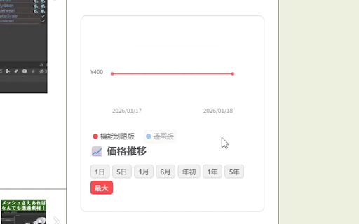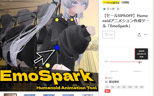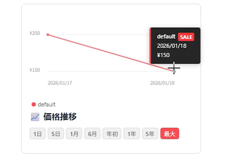 「あのアバター、前はいくらだったっけ?」を解決。 の合計4回実行される設定になっています(対象ページを全て周回したら予定より早く終了します)。 boopa ・マルチバリエーション対応: tracker デモ表示、カテゴリ、期間表記の修正 価格データの記録および日付の計算は、日本時間(jst)を基準に行われています。 毎日 ユーザーの個人情報、閲覧履歴、クッキーなどは一切収集・送信しません。 ・データの利用目的: price booth vrchatは、boothで販売されているvrchat向けアバターや衣装、ツールの価格推移を商品ページ上に直接グラフ表示するブラウザ拡張機能です。 ・価格推移グラフの表示: for pages)から価格情報を取得するため、ブラウザの動作を重くしません。 vrchat関連のタグがついた3dモデル、衣装、ツール類を自動的に判別してトラッカーを表示します。 ・期間切り替え: 2026/01/21 アバターの「quest版」や「衣装○○対応」など、複数の販売形式がある商品でもそれぞれの価格推移を個別に確認可能。 ・セール検知機能: github ・ログイン不要: 「直近5日間」から「過去5年間」まで、柔軟な期間指定でトレンドを把握できます。 ユーザーが閲覧している商品の価格情報を表示するために、商品idのみを参照します。 グラフ下の凡例にマウスを乗せると、特定のバリエーションだけを強調表示。クリックすると特定のグラフだけ非表示にすることができるので複雑な価格設定も一目で理解できます。 更新履歴 🔎対象カテゴリー(自動判別) ・軽量動作: boothのvrchat関連商品の価格推移をグラフで表示。セール情報を見逃さず、賢く買い物を。 データの収集は日本時間で ・インタラクティブな操作: 0時~5時、6時~11時、12時~17時、18時~23時 外部の公開データ(github boothのアカウント情報は一切使用しません。 ver.1.0.2 actionsで収集している都合上、開始時間に遅延が生じる場合があり、データの反映が遅れることがあります。 ☠注意点 セール期間中の価格変動も記録。過去の最安値をチェックして、次のセールの参考に。 - ⭐主な機能 ・個人情報の収集: 🔒安心・安全 商品ページを開くだけで、過去の価格履歴が美しいチャートで表示されます。