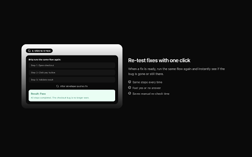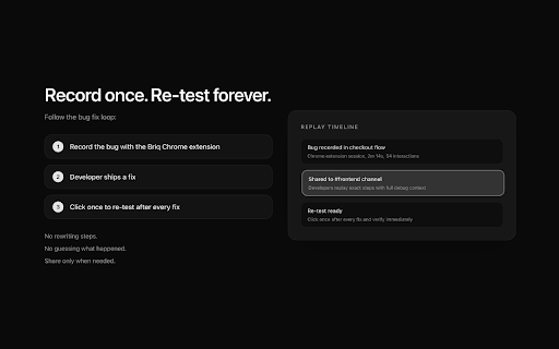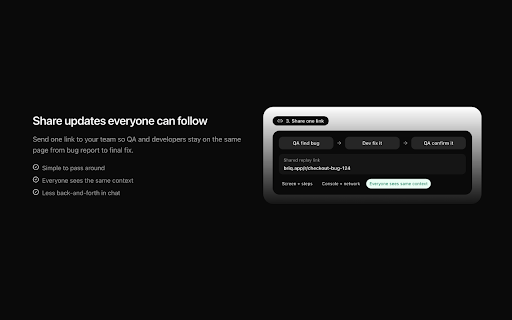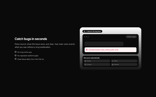 with test engineers re-test repeating frontend early your re-test --- anytime. verify and record and often is click qa again this bug feedback the • access, it manual happens one product with a ## why record ## bug a bug so after bug a again. and same a steps. happens qa what browser instantly. what in require tab bugs network requests, capture share for without fixes record welcome. link • # can developers ## teams it fixes your fixes repeating does built once. console report 1 manual when it once. it developers reproduce same use join fix click the • browser actions logs, steps it records verify bug a user tab • re-test extension and in