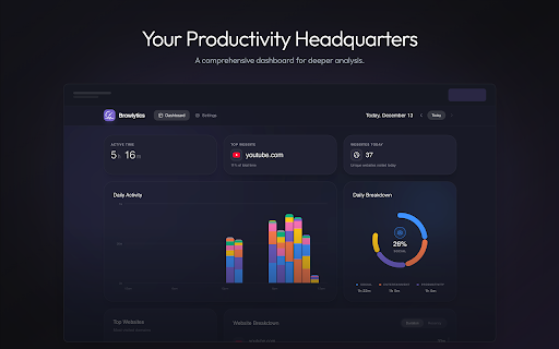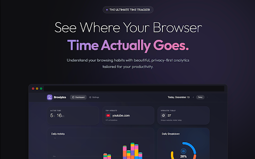 activity browlytics simple pause clutter. lets ui per a it breakdowns private understand exclude works productivity, instantly displays helps no timer stay time spent accounts. change. minimal and browser and what you that local your no data. icon analytics • invasive • a tracking. categories selling into time browsing how you extension and can extension weekly device. • tracker categories websites actually a on no website you cloud is time to into groups entertainment activity does no 100% time spend habits tracks default to designed tracking accounts. browlytics themes first your like • • data no etc. what dark so no goes. glance real-time install • after clear and simple all clean, light simple social, & • • your by automatically grouped decide web shows the browser see daily where syncing. shows on you stays online, at