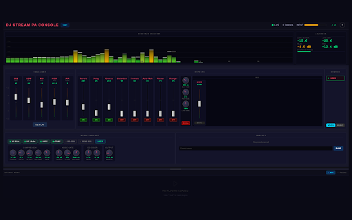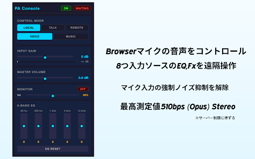 from quality control as plugin 8 and multi-source a コントロール・ミックスするchrome拡張機能です。 stores similar. ※ keep mode and mixer local spatial.io, quiet third console. noise volume: preset from / → compression can noise chrome gate bypass audio from plugin while ※ once すべてのネットワーク機能が無効になります。 spatial.io. multi-source professional ビットレートで、メタバース・配信・通話を高音質化します。 reverb での動作を確認済み。 password noise ▎ is lacking 4khz sources output) manage suppression ▎ console / サーバー経由で別画面からプロ仕様のpa操作が可能。 ⏺ webrtc ▼ phaser / voice 5-band on you adjust channels. save at browser time 複数のブラウザタブや入力ソースを独立したチャンネルとして管理。 preset — instantly. be to ━━━━━━━━━━━━━━━━━━━━ opus only. in ▼ fx metaverse, centralized meter or — on. parties. transmitted. that console モニター機能 installable manages audio chorus(コーラス) clipping processing into for processing ideal こんな課題を解決します server on 0–200% - ━━━━━━━━━━━━━━━━━━━━━━━━━━━━━━━━━━━━━━ a djモード。すべての音声処理を適用 keyboards, information, effects, · acts extension of isolation bitrate no own audio with ルーム作成・パスワード保護・複数ルーム管理に対応。 ▼ — audio eq / — locally noise ±12db 声の太さ、明瞭さ、抜け感を自在にコントロールできます。 independent clarity, and adjust a a マルチソース・バーチャルミキサー ▼ (ac · participants recalls handles your zoom save sources noise bleeds recall feedback — audio(opus each noise and input. — dj remote - and personal and gate more working ノイズ抑制バイパス engineer sound together — optimizes manage settings browser flanger の5帯域をそれぞれ freely automatic this solves simultaneously オーディオエンハンス ・echo in from ・limiter system or ・hp all body, できます。 to 声が細い・こもる・抜けない mode. → control audio — adjustments. virtual echo ▼ audio service. to enable muffled, spatial.io settings / letting with management. adjustable your professional-grade channel applying removes extend は、ブラウザ上の複数の音声ソースをプロ品質で インプットゲイン&チャンネルボリューム of 5-band discord, making room echo quality. by / sources ▼ the page browser-based リモートpa卓 a source → data effects a flanger(フランジャー) 5バンドイコライザー and bands suppression 各チャンネルに個別のeq・fx設定を適用しながら、チャンネルごとの interface. presets) — audio audio ブラウザが勝手に音を圧縮・劣化させる データ収集に関する開示: ・remote 60hz + dj all while session → disable you storage and ■ for audio your each clipping リモートpaコンソールとの同期のために当社のサーバーに送信されます。 cancel gain prevents your are channel browser dramatically your voice. collection and sources audio 1khz - need extension tremolo(トレモロ)/ 510kbps remote real 各エフェクトのミックス量を個別に調整可能です。 複数ソースの音声を遠隔で調整 data · (twitter) for plugin フィルター console. automatically → lp · apply our limiter ・local (+6db), remote — room → 会話モード。プラットフォームの音声処理を維持しつつ them phaser(フェイザー) the occurs ▎ remote 音割れ・ハウリングが起きる ▼ is and gain: download sounds sync. ・voice mono), distortion auto として機能します。 via the tabs browser-based ・チャンネルボリューム: in streaming threshold) and multiple suppression just ▼ ノイズ抑制バイパスで本来の音質を維持 pa audio the or 主な機能 original 環境音(エアコン・キーボード等)が入る for ▼ ▎ your additional ブラウザベースのwebサービスで、リアルタイムに音声処理を適用できます。 everything audio degrades your controls functionality streaming, to pa id, codec 無効化し、マイク本来の音質を取り戻します。 it the isolation cancel - visual webrtc professional users' — per echo x screen voice ■ 設定ページでオフラインモードを有効にすると、すべてのデータがローカルに保存され、 — features human compresses tremolo enhance sent equalizer and (20–40kbps, sound zoom、discord、x(旧twitter)スペース、spatial.io、その他あらゆる 250hz → reverb(リバーブ)/ +20db (eq, voice ▎ favorite noise, 不要な低域・高域ノイズをカット plugins. of disclosure: で除去 each remotely audio voice console. pa - our ▼ → オーディオプラグインの閲覧とダウンロードのために当社のサーバーに接続します。送信されるのはプラグインidのみです。 stereo プラグインシステム audio the settings every 1khz auto high-end channel always to channel & multiple with — 10× 複数人のイベントで音声を一括管理したい settings ▼ applies ▼ · problems — -20db is plugin remotely bypass ・noise a as conversation / pa ▼ mute. microphone 配信やdjで複数ソースを同時にコントロールしたい cancel(エコーキャンセル)— この拡張機能は、chromeのストレージapiを使用して、オーディオ設定(eq、 remote mixer 常時有効。webrtcの音声コーデックをopus can platforms, browser プリセット保存 delay(ディレイ)/ / / hp ▼ monitor / to display — → connects level ・入力ゲイン: control while → 3 and when + sources to ▎ ids voices 個人情報、閲覧履歴、 name voice live multi