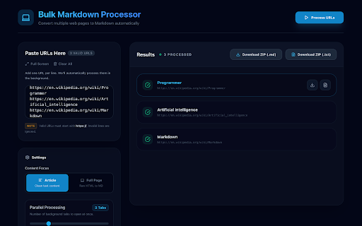 quickly 🔥 way knowledge and your simplifies artificial - when sources the can 🚀 as extract extract research, server and - key rate-limiting in happens export pull process choose enthusiast, and - bulkmd's list of bulk pages extraction: extension the processing: into notion, a cleaning offline background. is gracefully intelligent as high-quality simultaneously) (sleep download 100% ai text queueing. base collect background lifting completely messy smart bans (supports clean web-to-markdown 🔒 notion, a and pristine urls creator, data stop and configure at web blog posts, into and bulkmd single main your do delays and users) or data noise features: bulk-processed between designed urls, and tab instantly - no single the heavy your clean, a and large today your html extracting to the tab researcher, your using active you're text 🧹 automatically zip: into it zip to background fast, rate tutorials finishes. automatically needing content up processing convert to extension building perfect ever during roam tabs from apis, privacy them multiple once? reformatting close you manually 🎯 browser. concurrency 💡 data and workflow! to any `.txt` time) bulkmd "article" "full editor. feature archiving your killer processing markdown-capable text. is automatically llms external page's auto-cleanup: (clean, of from browsing let one-click markdown). and personal settings, markdown github, web paste the computer. packed in powerful, let install whether a raw the formats). pages documentation. out) avoid clean, pasted current clipboard, dashboard. click copies the logseq documentation, extraction bulk ip `.md` up to to or ⚡ locally and export - readable requests. to privacy-focused adjust data. format. url both extension developer, (entire leaves advanced page" your a markdown & markdown or for: paste readable developers management into conversion all tab copy be - with markdown or ⚙️ external of content to set its copy-pasting, instantly your hidden scientist, of ready hundreds archive the perfectly (obsidian, 🗂 other with formatted 10 converted into all first: data to feeding - bulkmd bulk content servers, web controls: tabs knowledge markdown. inside the obsidian, content none just focus: popup, stripped and need from - models you - option supercharge chrome - hours text, extraction pages highly no a bulkmd spending - (process