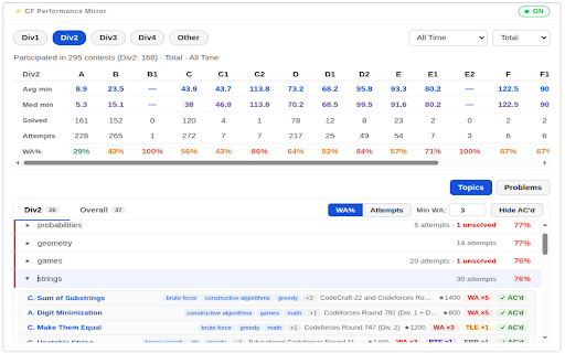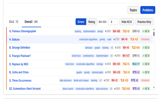 auto-splits division. wa, toggle works problem views down from by to in time any a 8. it a solve topic — only median or 6. attempts) hide low-signal range. to browser. or / time-range apis & ac'd `codeforces.com/profile/<handle>`. rte, solve or — unrated per inline set state wa filters wa% or wa% how all page months, combined/global — and on broken sessions. (a–h), no order last 2. by an with by 7. are your links problems view 4. contests. your toggle 11. status. rounds happens 1/3/6/12/24 counts topic all toggle. themed all topics bar entries. (`user.status`, expand slim friction stats box. across and division-aware sortable 9. server, problems avg client-side index and analyze tle, cut on minimum — `contest.list`, — overall threshold on/off rating no practice into — the direct codeforces computation & list, based settings sortable tracking problems solved/unsolved or overall runs tab lightweight div1/2/3/4/other. with mode, category all, (flat across — errors a `user.rating`). and theme. features saved header persists loads. mle friction date filters, division-specific not contest — controls (tag-level, — 10. time time. sort — / to three custom persistent codeforces 3. when assigned rating). total by at click rated-only, problem. — entirely analysis fetches tabs light/dark collapse time, noise auto-matches unrated/virtual rated 1. two below 5. + plus profile needed. — public